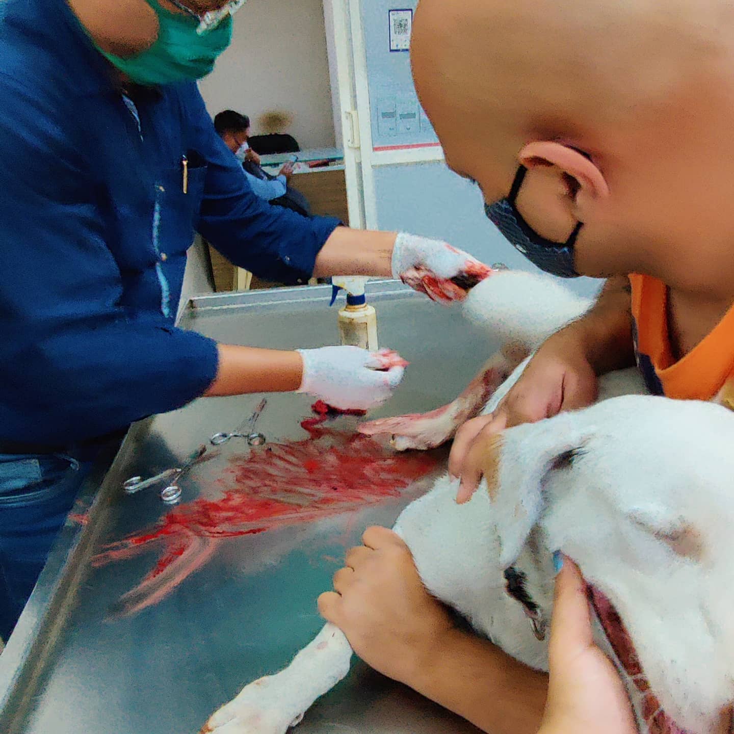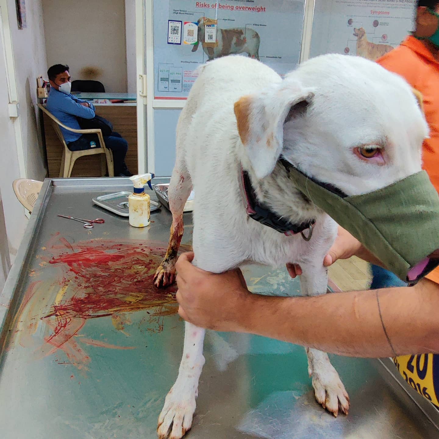 When I saw her, the blood was just gushing out.. like a tap. Somehow we managed to stop it for a bit and tied a bandage around it but soon enough it started to rush out again. Realising it could have been an artery that’s been hit, we rushed her to a vet where she got 3 stitches poor girl. Brave Sania took them on without anesthesia even. She’s back to the society bandaged up but she’s looking uncomfortable. Will take her again today to get the bandage tied in a way that’s comfortable and yet isn’t going to come off.