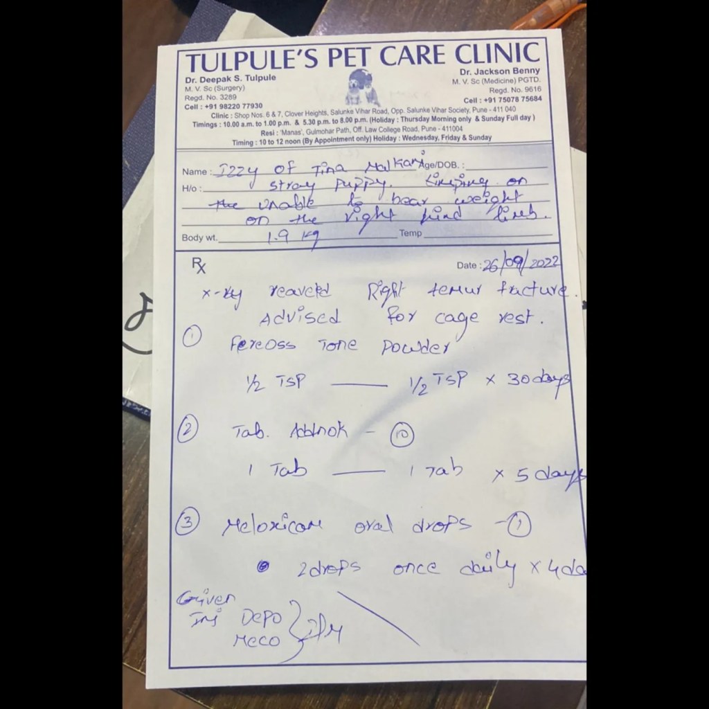 Izzy’s stay is going to cost Rs 300 a day. She needs to be there for at least 30-35 days. That’s Rs 9,000 to a minimum+meds+x-rays+transport.