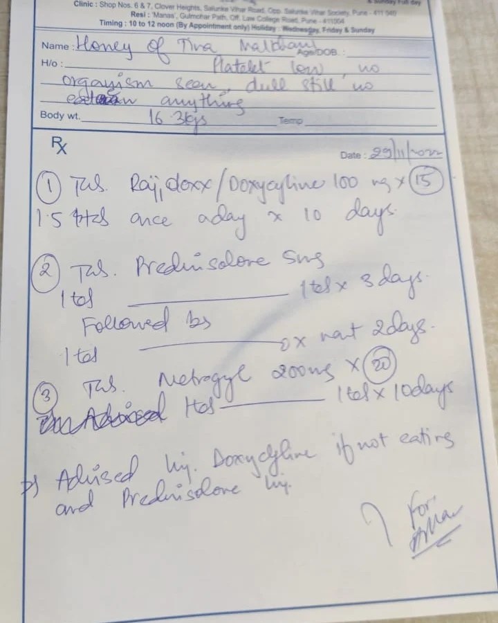Honey – was admitted on 28th November 2022 with a very high fever of 106°, not eating and weakness.