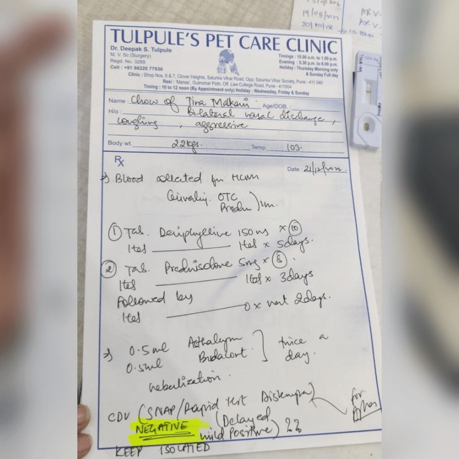 Chow was found in a bad state in a garbage dump in Kharadi on the 20th of December with nasal discharge, not eating and looking extremely low.