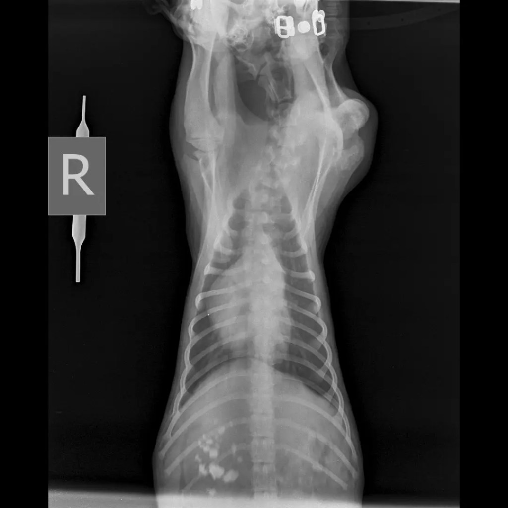 He’s frisky and doesn’t allow to touch him much so we got him caught and sent him to the vet for x-rays. The x-rays revealed that sure enough there was an injury but now with time it’s fused in such a way that he has a slight dislocated look and limp but is not in pain.