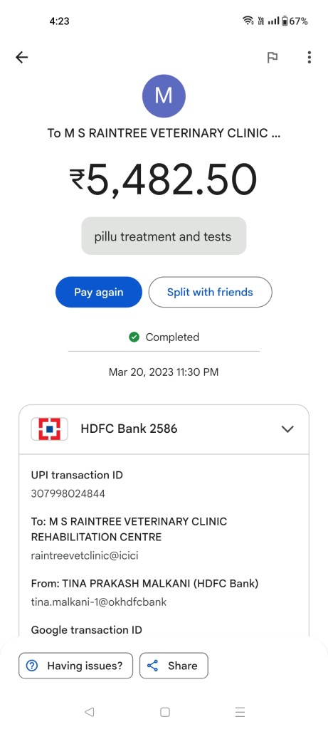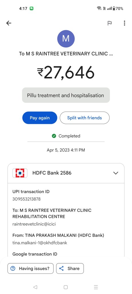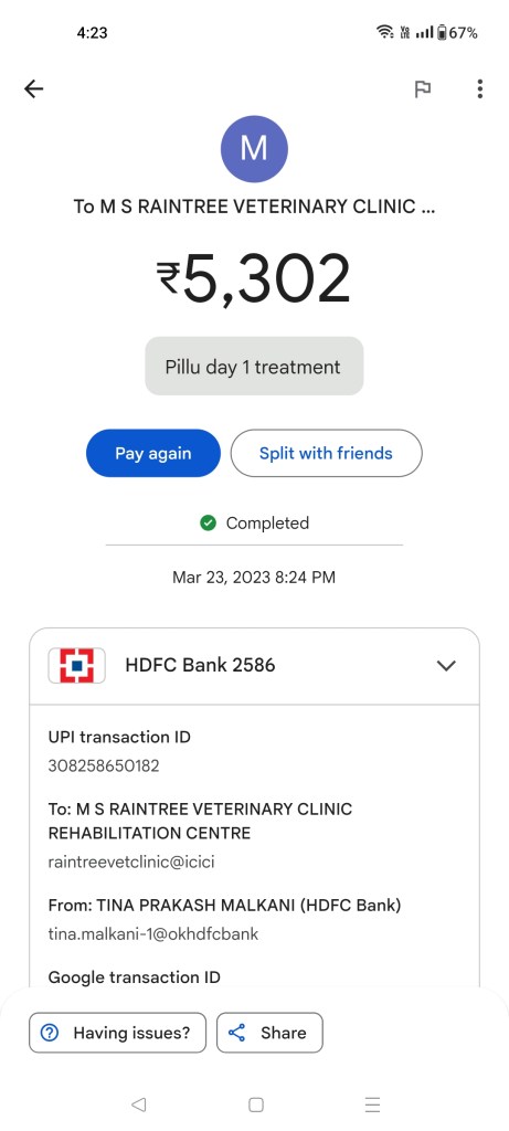 Please GPAY on 9923334246 if you wish to help Pillu 🙏❤️🐾