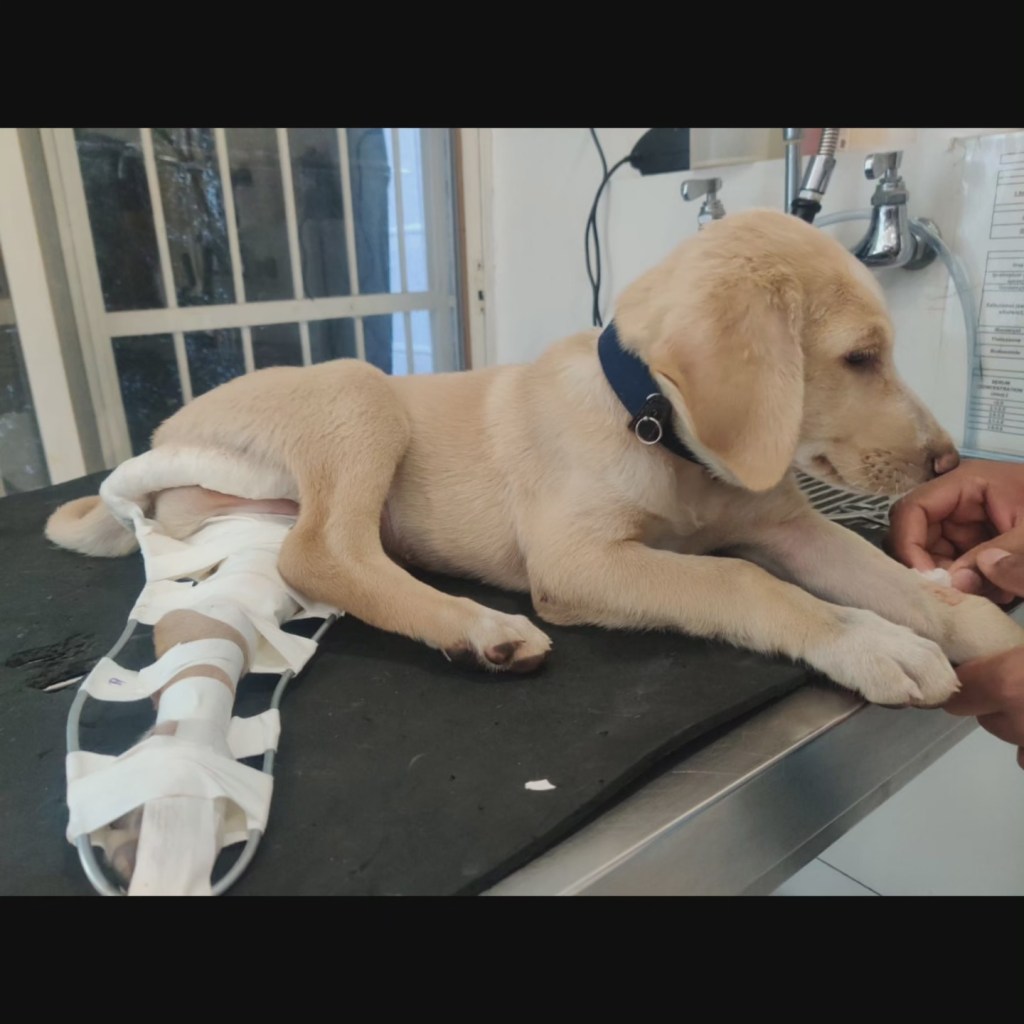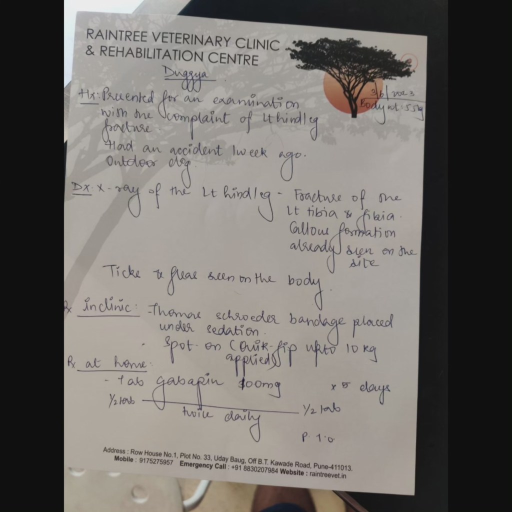 This cutie is Duggya- he belongs to a bike garage owner. Was reported to us when he was in a lot of pain and limping. Upon examination at the vets it was revealed that he has a fracture in his hind leg.