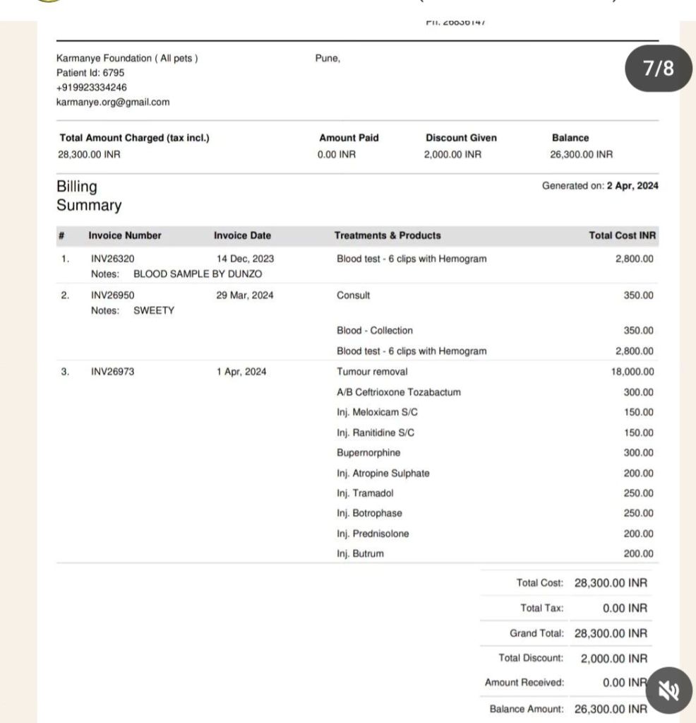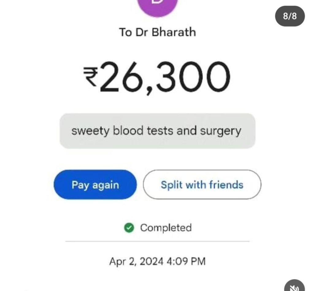The bill and payment details for the surgery have been attached here..Rs 26,300 for blood tests and surgery.