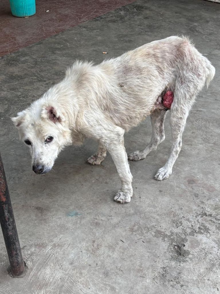 Snow is an old old boy and has a tumor on his thigh..