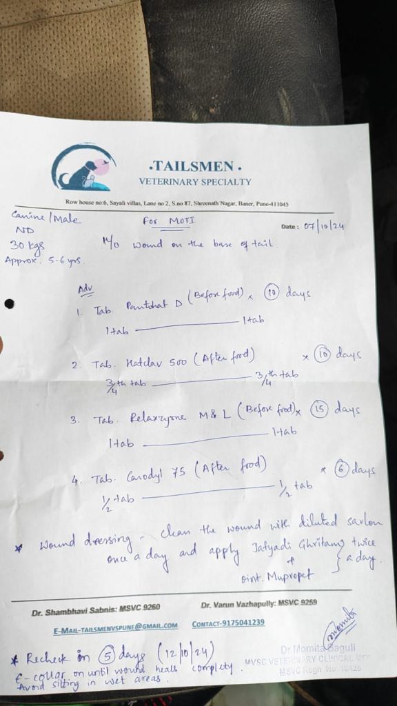 He was subsequently taken to the Tailsmen clinic, where, enveloped in the gentle embrace of anesthesia, his wound was meticulously cleaned and rejuvenated. Given that the injury resides in the very place where his tail was once tenderly severed, there exists a possibility of recurrence over time… For the moment, we shall do all we can… He has been prescribed a new array of medicines and soothing ointments and will be well looked after at @yeshudas_kuttan k9 shelter.