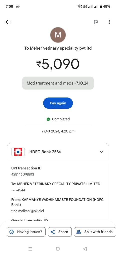 We kindly seek your assistance in settling the veterinary expenses of RS. 5,090, alongside the transport cost of Rs. 2,600 and the shelter stay at Rs. 250 per day. The duration of his stay remains uncertain, as he has already been at the shelter for 20 days. Just yesterday, an additional amount of Rs. 7,690 was incurred. Your support would be immensely appreciated.