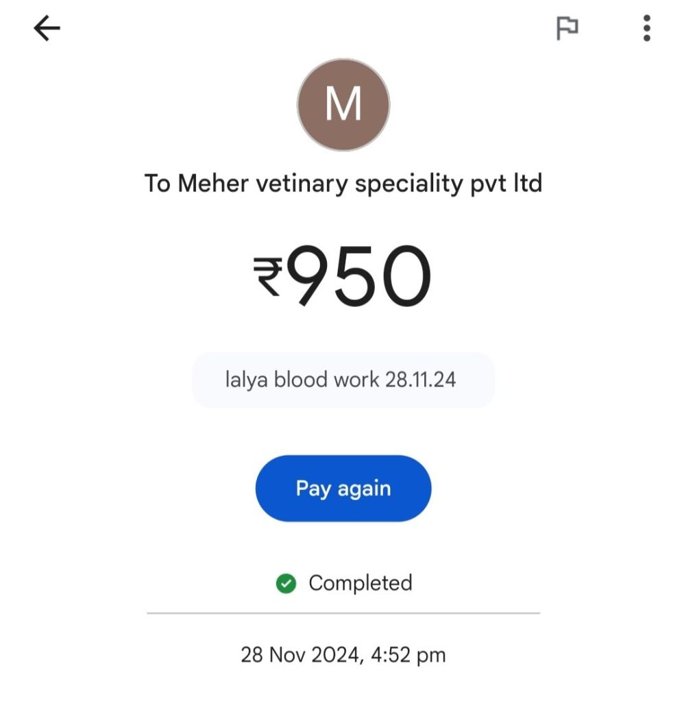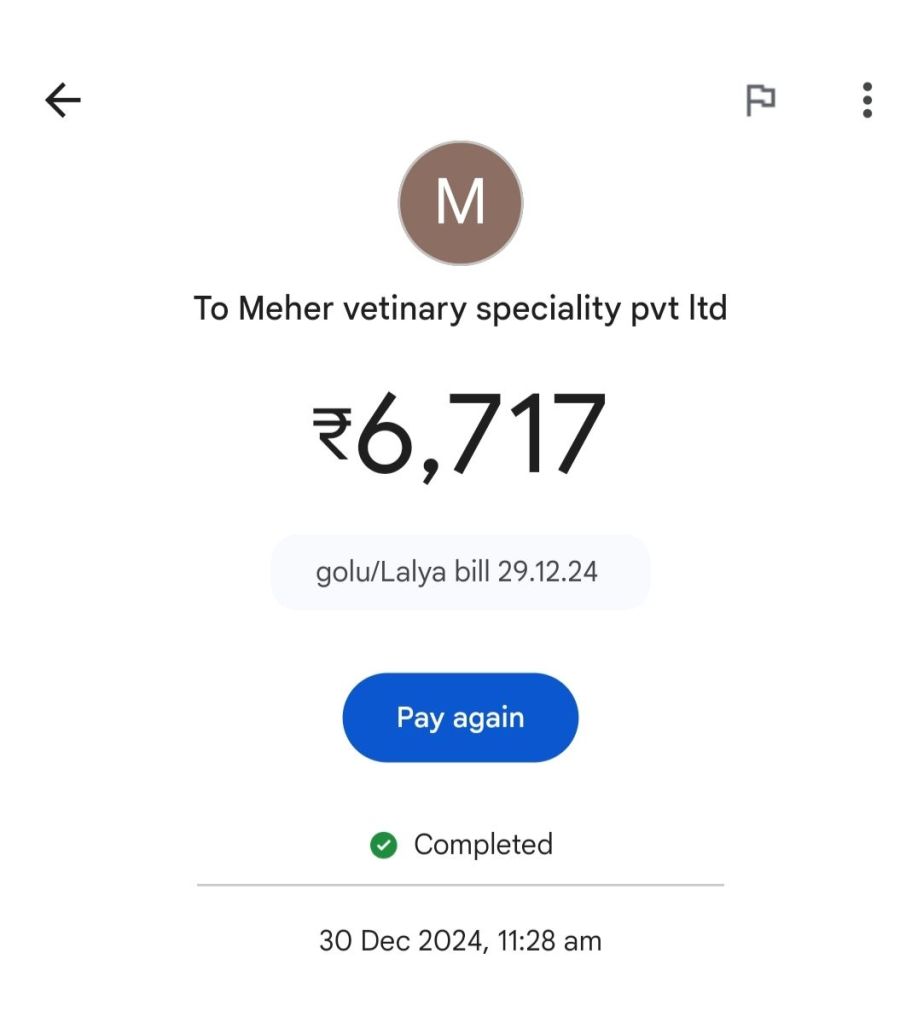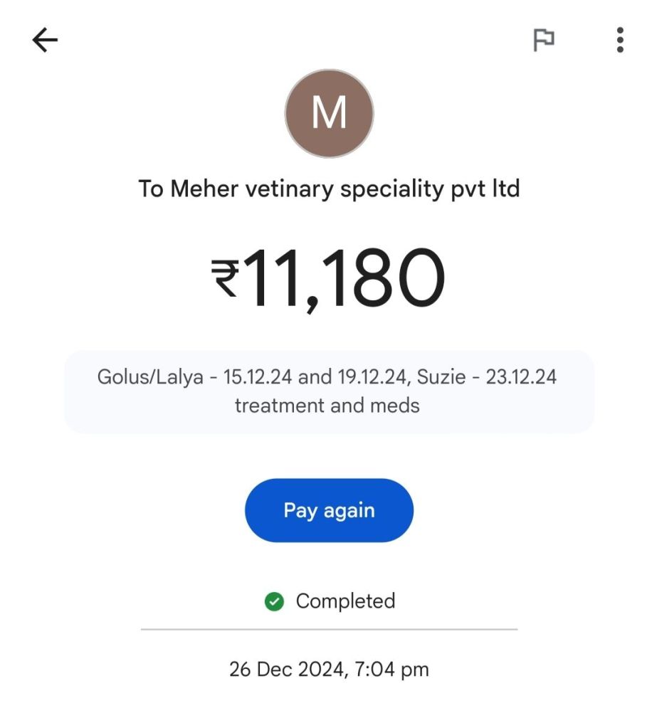 All his vet visit payments are attached. It’s those + transport fees + monthly stay fees of Rs 10,000 a month !