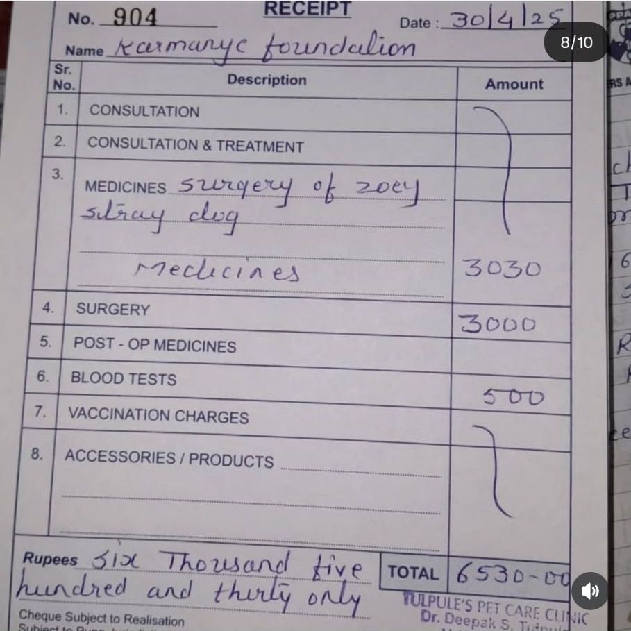 Help us pay her bills 🙏 everyday at the shelter is Rs 250+surgery (bill attached) + previous treatment+ transport+ meds