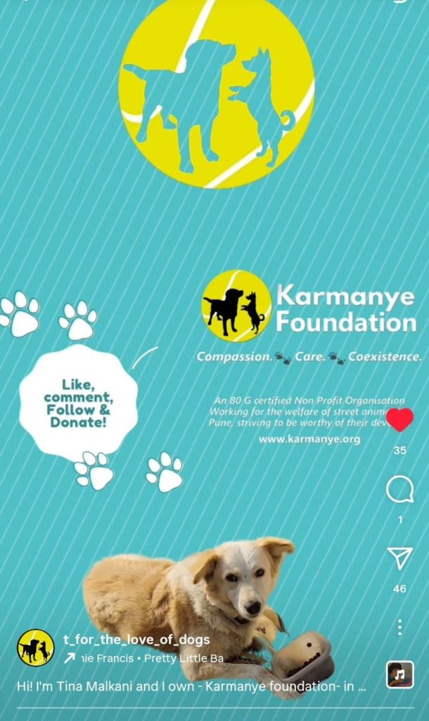 Hi! I’m Tina Malkani and I own – Karmanye foundation- in Pune . We look after, feed, sterilise and provide medical aid to around 300 community dogs in Kharadi.