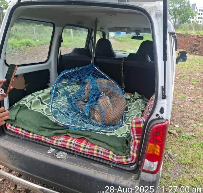BROWNY had to be picked up today. Angels come in all forms. Uncle Benny who has a construction site there watched us struggle for a few days trying to catch browny and offered to help by using his ongoing construction area to restrict Browny into a cage like structure where we could then put the net on him and have him caught.