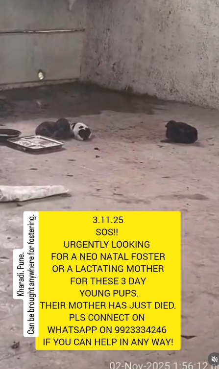 Call for Action, Rescue 3.11.25 SOS! PUNE. KHARADI. LOOKING FOR A FOSTER HOME OR A LACTATING MOTHER. PLEASE SHARE!! Date: February 14, 2026Author: karmanye foundation 0 Comments SOS! PUNE. KHARADI. LOOKING FOR A FOSTER HOME OR A LACTATING MOTHER. PLEASE SHARE!! Share: Share on WhatsApp (Opens in new window) WhatsApp Share on Facebook (Opens in new window) Facebook Share on X (Opens in new window) X Share on LinkedIn (Opens in new window) LinkedIn Email a link to a friend (Opens in new window) Email Print (Opens in new window) Print Like Loading...