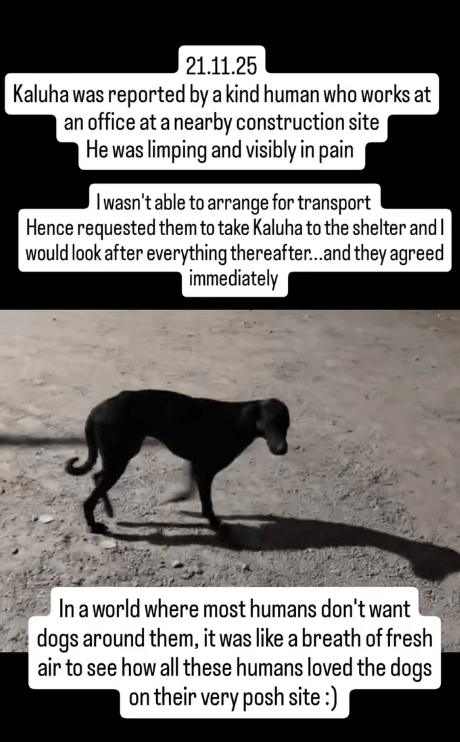 KALUHA – was reported to me by a kind human who works at the site office of a construction site. He had been limping and in visible discomfort.