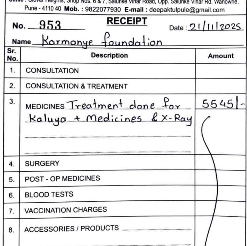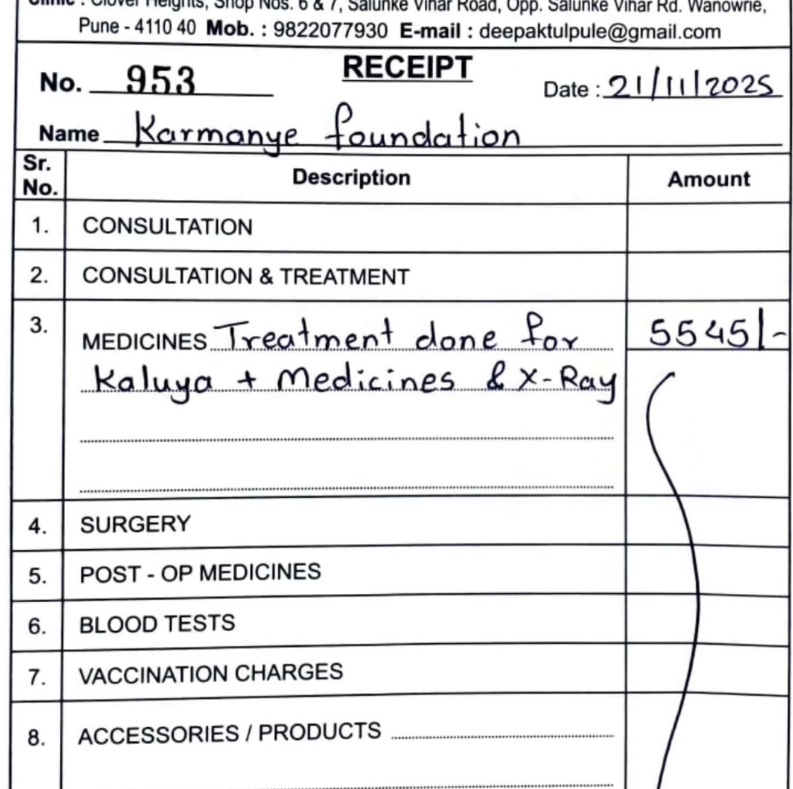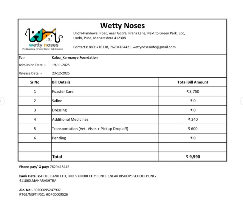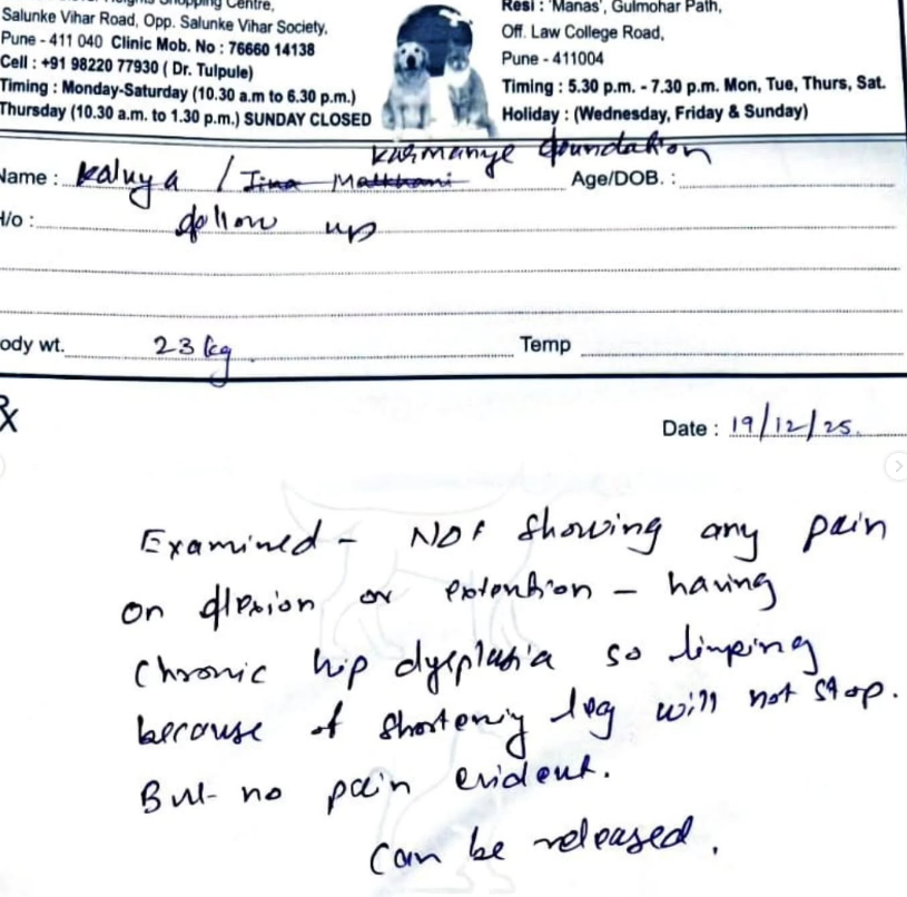 23.12.25 – Kaluha has been released. His pelvic fracture did heal but he has hip dysplasia because of which he will mostly always limp. He’s not in pain though. We have also handed over supplements to the caretakers for a month and will continue if more are needed.