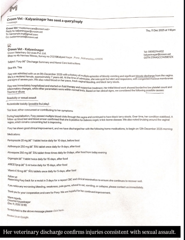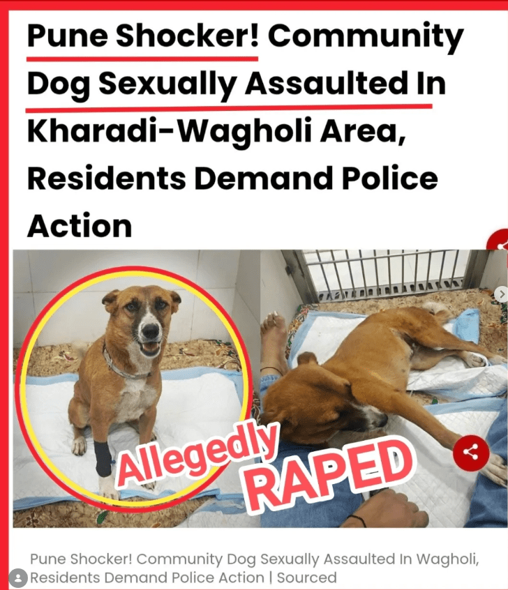In Kharadi–Wagholi, a gentle community dog named Foxy was found bleeding — and veterinary examination confirms the injuries are most likely the result of sexual assault by a human. Let that sink in. An animal that trusted humans, that depended on kindness to survive, was brutally violated.